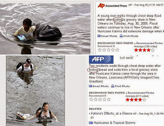 யாஹூ இணையதளத்தில் வெளியிடப்பட்ட இரு நிழற்படங்களில் ஒன்றில் கருப்பினத்தவர் ஒருவர் சில உணவுப் பொருட்களைச் சுமந்து கொண்டு மார்பளவு நீரில் நீந்திச் செல்கிறார்.மற்றொரு நிழற்படத்தில் வெள்ளையர் ஒருவரும் ஒரு பெண்மணியும் முதுகிலும் கைகளிலும் பொருட்களைச் சுமந்து கொண்டு அதே போல நீந்திச் செல்கின்றனர்.ஒரே நாளில் ஒரே இணையத் தளத்தில் வெளியிடப்பட்ட இவ்விரு நிழற்படங்களில் முதலாவதில் அந்தக் கருப்பினத்தவர் உணவுப் பொருட்களைச் ‘சூறையாடிச்’ செல்வதாகவும் வெள்ளையர்கள் அப்பொருட்களைக் ‘கண்டுபிடித்துச்’ செல்வதாகவும் செய்திகள் வெளியிடப்பட்டிருந்தன.