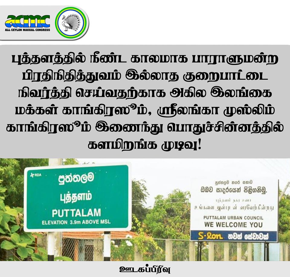 புத்தளம் மாவட்டத்தில் அகில இலங்கை மக்கள் காங்கிரஸும் ஸ்ரீலங்கா முஸ்லிம் காங்கிரஸும் இணைந்து, பொதுச்சின்னத்தில் போட்டியிடுவதென முடிவு செய்யப்பட்டுள்ளது. கொழும்பில் நேற்று இரவு (11) மக்கள் காங்கிரஸ் தலைவர் ரிஷாட் பதியுதீன் தலைமையிலான குழுவுக்கும், முஸ்லிம் காங்கிரஸ் தலைவர் ரவூப் ஹக்கீம் தலைமையிலான குழுவுக்கும் இடையில் இடம்பெற்ற பேச்சுவார்த்தையின் பின்னர், இந்த முடிவு எடுக்கப்பட்டது.