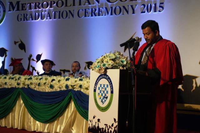 இந்த மெற்றோபொலிட்டன் கல்வி நிறுவனம் அமேரிக்கா மற்றும் லண்டன், கல்வி நிலையங்களுடன் இணைந்து சர்வ தேச மட்டத்தில் தமது பட்டப் படிப்பையோ ,டிப்ளோமா சான்றிதழ்களை பெற்று முன்னேறுவதற்கு காலநதி சிறாஸ் மீராசாஹிபை தலைவராகக் கொண்டு வரும் இக் கல்லுாாி மேலும் விருத்தி பெற்று இந்த நாட்டின் கல்விச் சமுகத்திற்கு சிறந்த சேவையை ஆற்றுவதற்று நான் வாழ்த்துவாதாகவும் இன்று வெளியேறும் பட்டதாரிகள் டிப்ளோமா தாரிகளுக்கும் தமது வாழ்த்துக்களை தெரிவித்தாா்.