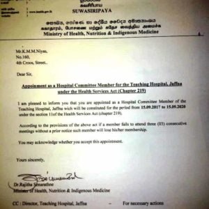 யாழ்ப்பாண போதனா வைத்தியசாலை குழு அங்கத்தவராக கே.எம்.நிலாம் நியமனம்!
