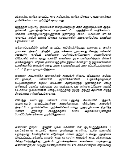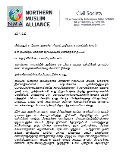 அமைச்சர் றிஷாட் பதியுதீன் முசலி மக்களின் மீள் குடியேற்றத்துக்காக 3 தசாப்தங்களாக காடாகிப் போன அவர்களது காணியை உரிய முறையில் வழங்குமாறு வேண்டுகோள் விடுப்பதில் என்ன குற்றம் உள்ளது? அகதியாக விரட்டப்பட்ட மக்களில் தானும் ஒருவராக சென்ற அமைச்சர் அந்த மக்களுடைய மீள்குடியேற்றத்துக்கு, அரசிடம் அம்மக்களுக்கான காணிகளை வழங்குமாறு அமைச்சர் றிஷாட் விடுத்த வேண்டுகோளை சில ஊடகங்கள் பிழையென்று செய்தி வெளியிட்டுருப்பதை எமது அமைப்பு வன்மையாகக் கண்டிக்கின்றது. வன்னி மாட்ட அபிவிருத்திக் குழுத் தலைவரும் வடக்கு முஸ்லிம்களின் பிரதிநிதி என்றவகையில் அவர்களுடைய பிரச்சினையைத் தீர்த்துத் தரும்படி அரசிடமே வேண்டினாரே தவிர அமைச்சர் தானாக எதையுமே செய்யவில்லை அரசு முறைப்படியே செய்துள்ளது.
