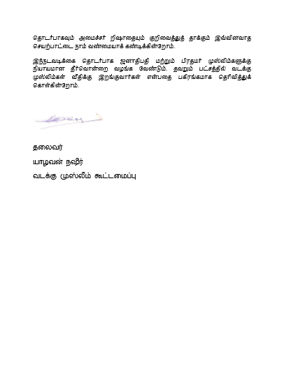 இந்நடவடிக்கை தொடர்பாக ஜனாதிபதி மற்றும் பிரதமர் முஸ்லிம்களுக்கு நியாயமான தீர்வொன்றை வழங்க வேண்டும். தவறும் பட்சத்தில் வடக்கு முஸ்லிம்கள் வீதிக்கு இறங்குவார்கள் என்பதை பகிரங்கமாக தெரிவித்துக் கொள்கின்றோம்.