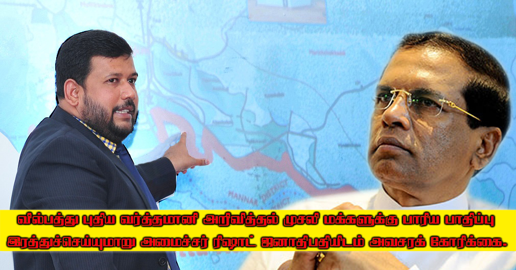 வில்பத்துத் தொடர்பான புதிய வர்த்தமானி அறிவித்தல், முசலிப் பிரதேச மக்களுக்குப் பெரும் பாதிப்பை ஏற்படுத்துவதால் அதனை உடனடியாக இரத்துச் செய்ய வேண்டுமென ஜனாதிபதி மைத்திரிபால சிரிசேனவிடம் அகில இலங்கை மக்கள் காங்கிரஸ் தலைவர் அமைச்சர் ரிஷாட் அவசர வேண்டுகோள் ஒன்றை விடுத்துள்ளார்.