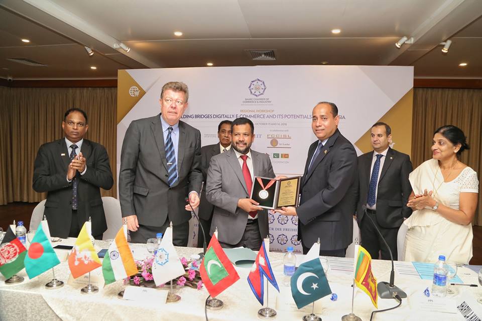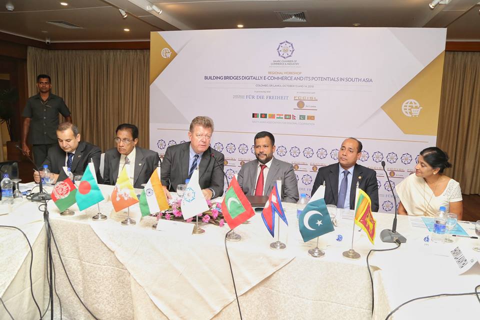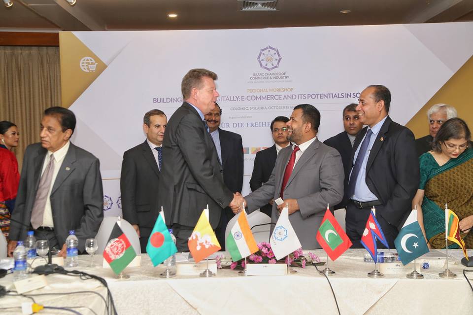 மின்-வணிகத்தில் நடுத்தர வர்த்தக வாய்ப்புகளை ஆராய்வதற்கான உயர்ந்த இடைக்கணிப்பு கொண்ட இந்நிகழ்வில், ஃபிரட்ரிச் நவுமன் அறக்கட்டளையின் (Friedrich Naumann Foundation for Liberty – FNF) பிராந்திய பணிப்பாளர் ரொனால்ட் மியனாடஸ் (Ronald Meinardus), பிராந்தியங்களுக்கிடையிலான வதிவிட பிரதிநிதி திருமதி.சாகரிக்கா தெல்கொட, சார்க் பிராந்திய வலையமைப்பின் வர்த்தகம் மற்றும் கைத்தொழில் சம்மேளனங்களின் தலைவர் ருவன் எதிரிசிங்க மற்றும் அதன் முன்னாள் சிரேஷ்ட உபதலைவர் வி.பி.நவாஸ் ரஜாப்டீன், செயலாளர் நாயகம் அஜித் பெரேரா மேலும், சார்க் நாடுகளிலிருந்து 20 க்கும் மேற்பட்ட பிரதிநிதிகளும் கலந்துகொண்டனர்.
