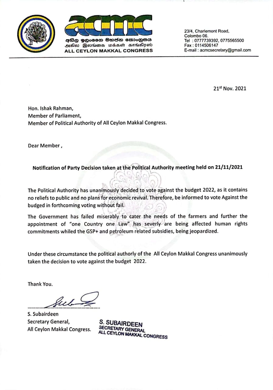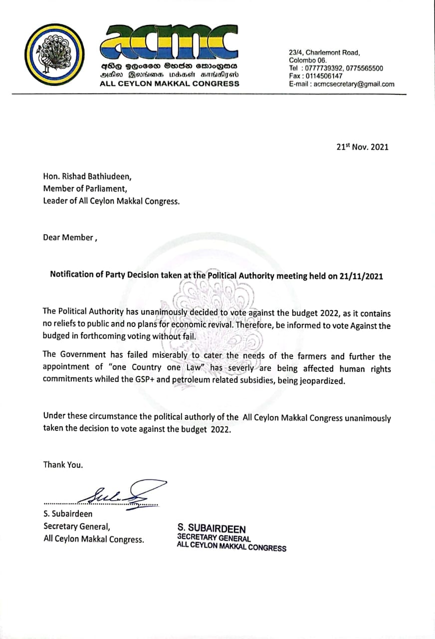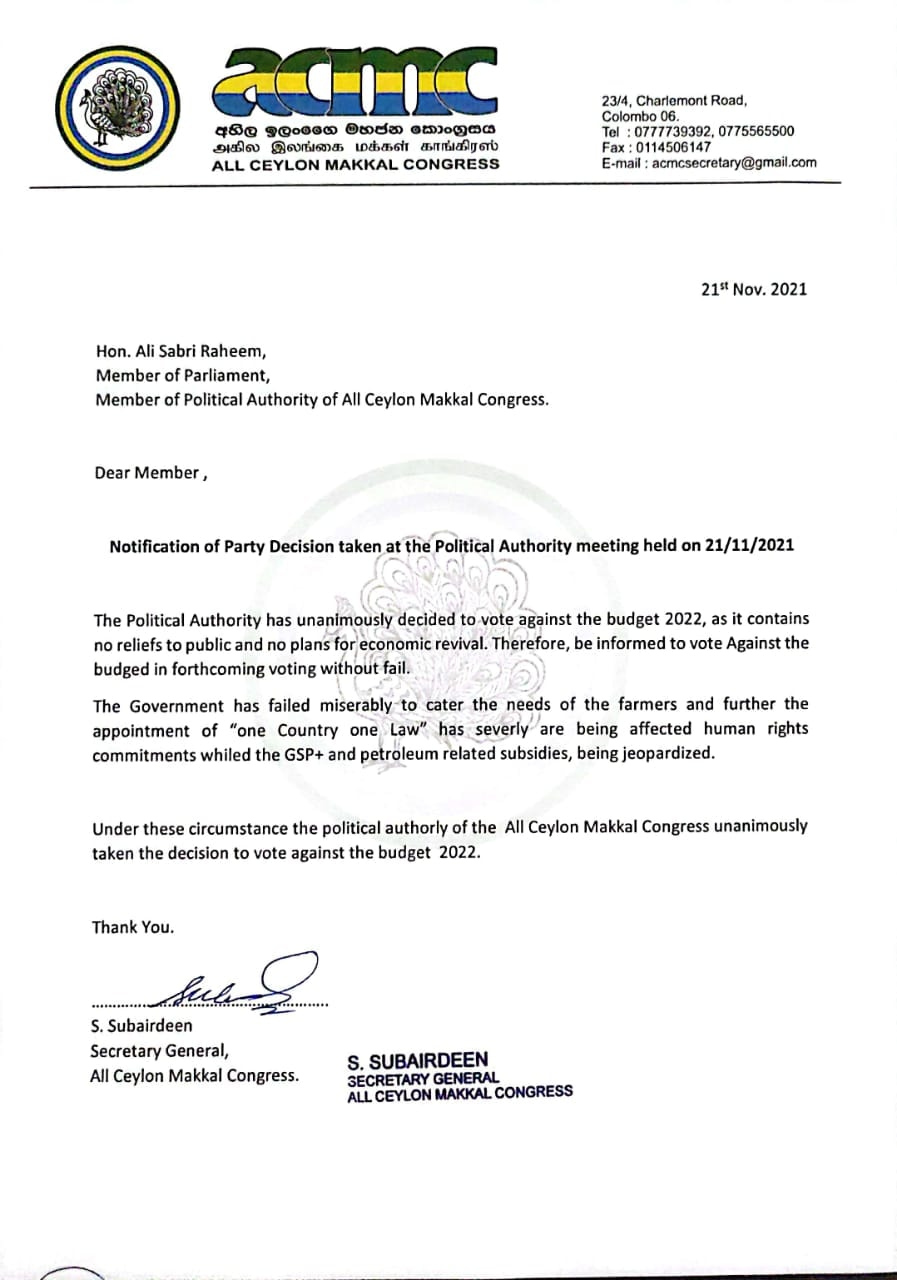 கட்சியின் இன்றைய அரசியல் அதிகார சபைக் கூட்டத்தில் கலந்துகொண்ட அனைத்து உறுப்பினர்களும் வரவுசெலவுத் திட்டத்திற்கு எதிராக வாக்களிக்க வேண்டும் என்பதற்கான நியாயங்களை முன்வைத்து கருத்துக்களை தெரிவித்ததன் அடிப்படையில், எதிர்வரும் 2021.11.22ஆம் திகதி பாராளுமன்றில் நடைபெறும் வரவு செலவுத்திட்ட வாக்கெடுப்பிலும், இறுதி வாக்கெடுப்பிலும் வரவுசெலவுத் திட்டத்தினை எதிர்த்து வாக்களிப்பதென அகில இலங்கை மக்கள் காங்கிரஸின் அரசியல் அதிகார சபை ஏகமனதாக தீர்மானித்துள்ளதோடு, வாக்கெடுப்பின் பின்னரான விடயங்கள் தொடர்பில் ஆராய்வதற்காக இன்றைய அரசியல் அதிகார சபைக் கூட்டம், நாளை 2021.11.22 இரவு 08 மணிக்கு ஒத்திவைக்கப்பட்டுள்ளது.