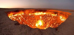 துர்க்மெனிஸ்தானின் அகால் மாகாணத்தில் தர்வாஷ் கிராமத்தில் பூமியின் மேற்பரப்பில் எப்போதும் எரிந்து கொண்டு இருக்கும் ஒரு பெரிய துளை ஒன்று கண்டு பிடிக்கபட்டது. இந்த துளையை 1971 ஆம் ஆண்டு ரஷ்ய ஆராய்ச்சியாளர் ஒருவர் கண்டு பிடித்தார். அந்த துளை பகுதியில் கடந்த 40 ஆண்டுகளுக்கு மேலாக தொடர்ந்து தீ ஜூவாலை வெளிப்பட்டு கொண்டுதான் இருக்கிறது.