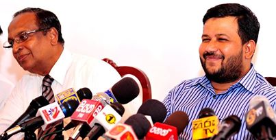 Rishad Bathiudeen (Minister of Industry and Commerce-right) and MM Zuhair (President’s Counsel representing Minister Bathiudeen-left) address the special press briefing in Colombo on 14 March.