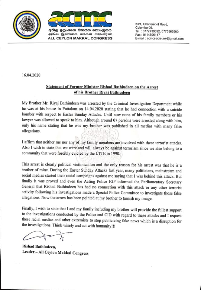 This arrest is clearly political victimization and the only reason for his arrest was that he is a brother of mine. During the Easter Sunday Attacks last year, many politicians, mainstream and social medias started their racial campaigns against me saying that I was behind this attack. But finally it was proved and even the Acting Police IGP informed the Parliamentary Secretary General that Rishad Bathiudeen has had no connection with this attack or any other terrorist activity following his investigations made a Special Police Committee to investigate those false allegations. Now the arrow has been pointed at my brother to tarnish my image.